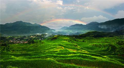 云和梯田一年四季景观各异:春来水满田畴,如串串银链挂山间;夏至佳禾吐翠,似层层绿浪排苍穹;金秋,稻穗沉甸,像座座金塔顶玉宇;隆冬,雪兆丰年,若环环白玉砌云端。